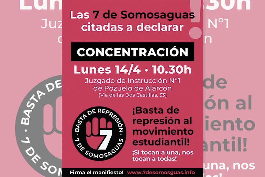 Vivimos una agresión profunda contra los derechos y libertades democráticas. El caso de las 7 de Somosaguas es un ejemplo muy representativo, pero no el único. Los 6 jóvenes de Zaragoza encarcelados desde hace más de un año por participar en una manifestación contra Vox, el encarcelamiento desde hace cuatro años de Pablo Hasél, las condenas a prisión de las 6 sindicalistas de la Suiza, la infiltración policial en organizaciones sociales y del movimiento estudiantil, la persecución al movimiento independentista catalán, y muchos ejemplos más, prueban la involución antidemocrática que se está desarrollando ante nuestros ojos.